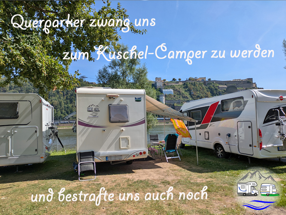 Campingplatz in Koblenz direkt am Rheinufer gelegen, mit Blick auf die Festung Ehrenbreitstein und Fährverbindung zum Deutschen Eck und zur Altstadt am anderen Moselufer. Wir fuhren den Platz auf der Rückfahrt von den Niederlanden am Weg nach Süddeutschland an.