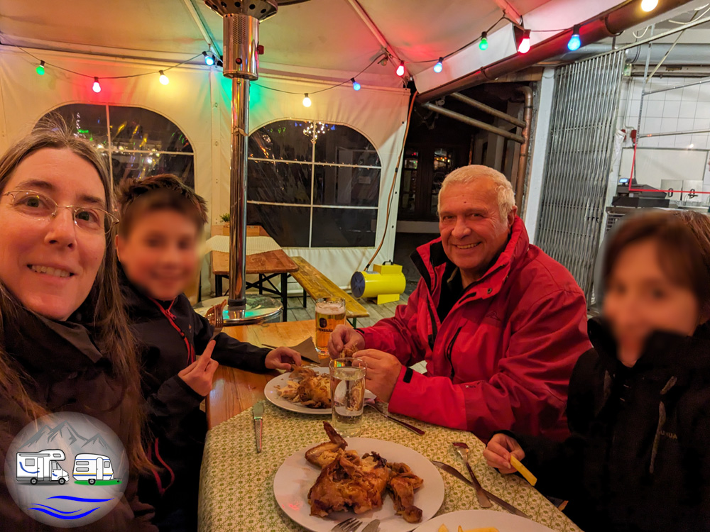 Gegen Abend lockt am Hauptplatz leckerer Brathuhnduft. An der Rezeption vorbestellt kann man das gebratene Hähnchen mit zum Stellplatz nehmen oder es im Zelt vor Ort verspeisen.