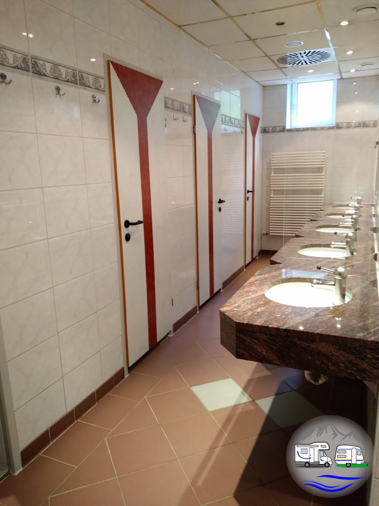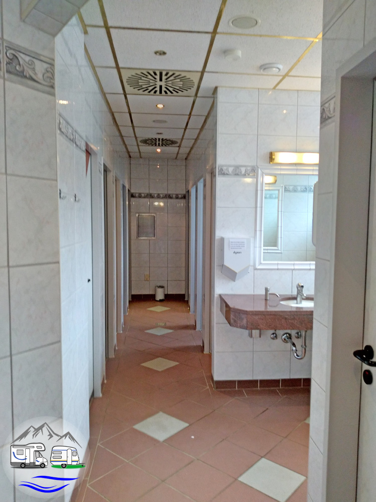 Im hinteren Bereich des Waschhauses befinden sich die Duschkabinen, Waschbecken, Waschbeckenkabinen und eine Ecke zum Föhnen. Es war der erste Campingplatz, den wir besuchten, der sogar eine Kabine mit Badewanne hatte.