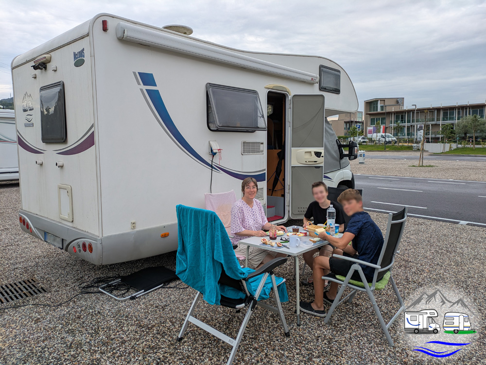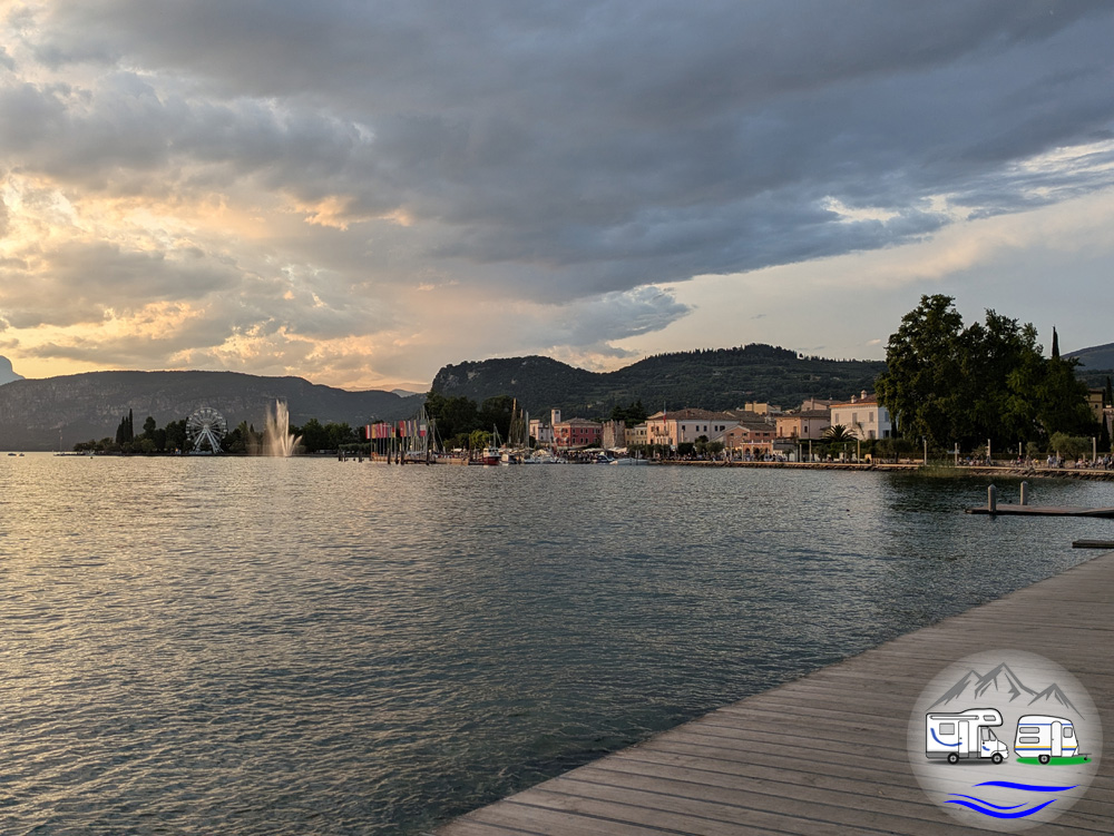 Der Park- und Stellplatz liegt ca. 800 Meter vom Ufer des Gardasees entfernt. Meine Schwägerin kannte ihn als total unebene Wiese. Wir fanden dagegen einen eingeebneten, frisch geteerten und gekiesten Stellplatz vor. Richtig einladend. Obwohl bei der Hitze Wiesenuntergrund sicherlich angenehmer gewesen wäre.