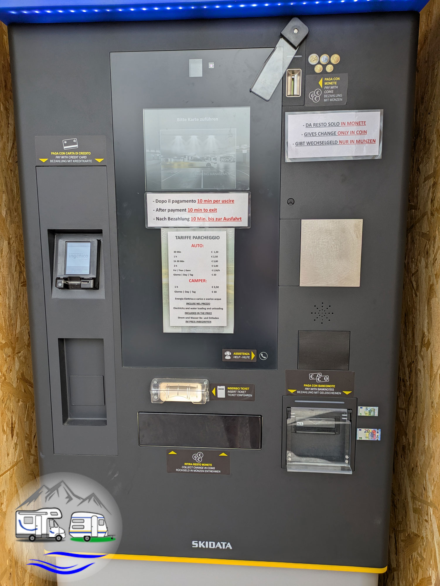 Der Stellplatz ist mit Schranke und Parkschein, zahlbar in bar oder mit Kreditkarte am Automaten. Nicht gerade billig. Der Automat ist in Italienisch, Englisch und Deutsch beschriftet.