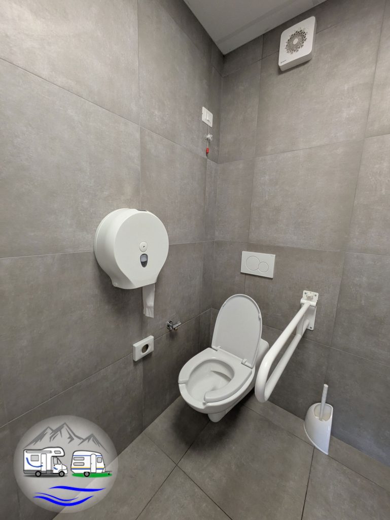 Frischwasseranschlüsse befinden sich an den Stromsäulen. Strom und Wasser sind inklusive. Am Rand des Platzes befindet sich eine Wohnmobil-Entsorgungsbucht. Außerdem steht eine modere WC-Anlage mit 2 WCs zur Verfügung, eines davon behindertengerecht. Das Licht im WC funktionierte mit Bewegungsmelder und brannte relativ kurz. Einmal saß ich deshalb plötzlich im Stockdunklen.