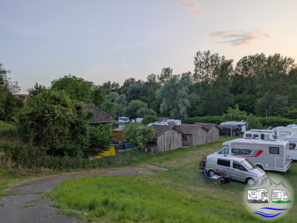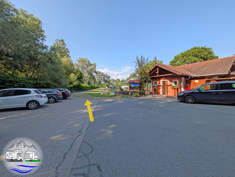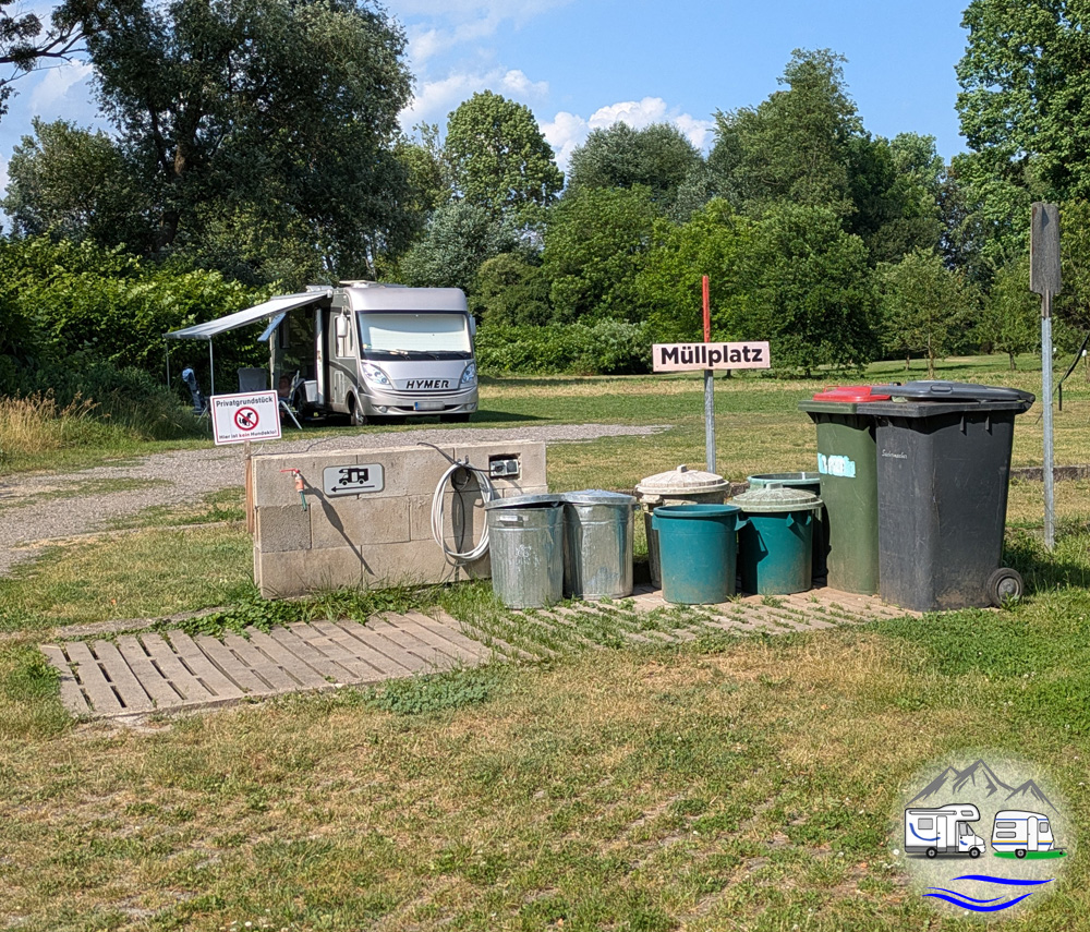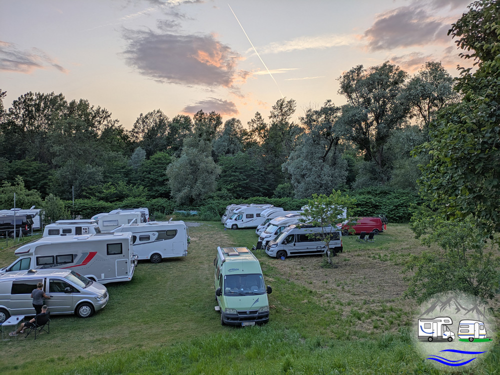 Wir hatten freie Platzwahl und – weil wir mittags ankamen – noch viel Auswahl. Wir stellten uns ans Seeufer neben einen bereits anwesenden Camper. Später platzierte sich ein weiterer Camper schräg hinter uns, die später Ankommenden stellten sich auf die Wiese hinter der Entsorgungsstation und den Holzhütten.