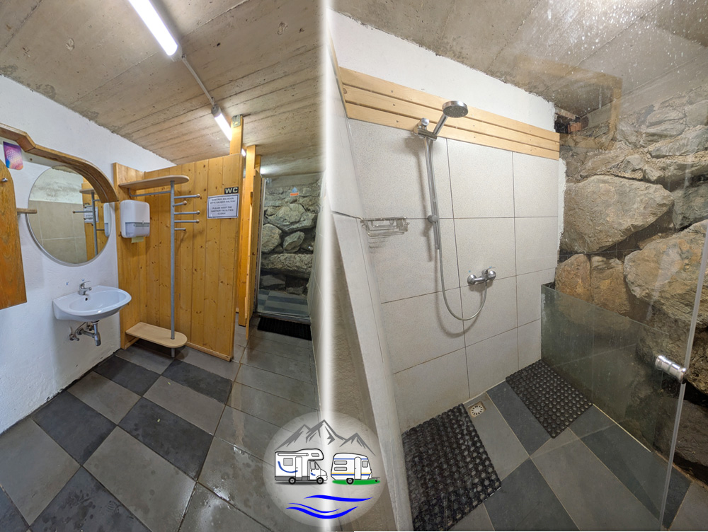 Die Sanitäranlage wurde in den befestigten Hang hinein gebaut und war sehr urig. Ein Raum war fertig, der Rest Baustelle. In dem nutzbaren Raum befand sich ein Waschbecken, eine WC-Kabine und dahinter eine Dusche mit Glastür.
