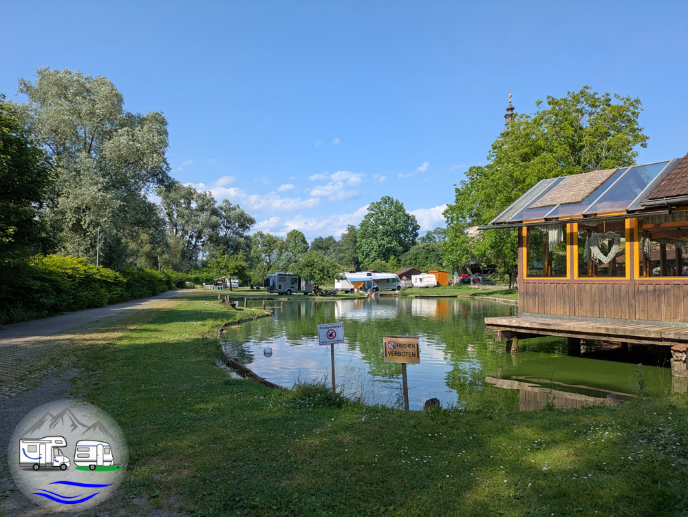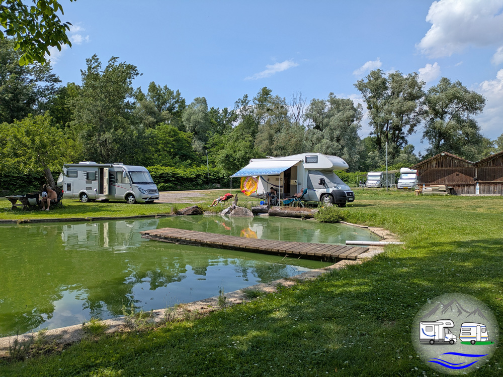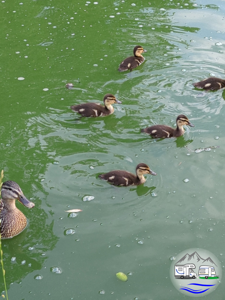 Der Fisch- und Ententeich macht den Stellplatz schön malerisch, ist aber nicht zum Baden geeignet. Angeln ist verboten. Wir freuten uns an der Entenfamilie, nicht aber an der Hinterlassenschaft direkt neben unserem Campingtisch.
