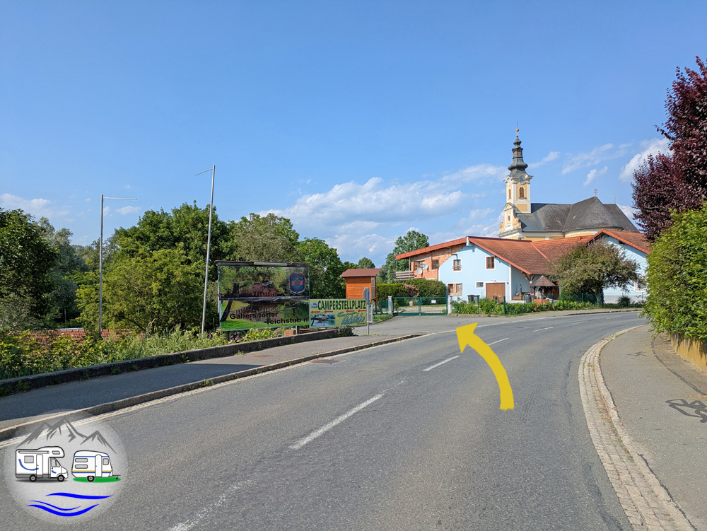 Das Gelände wird auf der einen Seite von einer Busch-Baumreihe begrenzt, hinter der ein Bach fließt. Auf der anderen Seite befindet sich ein Hang, auf dem oben die Kirche, Häuser bzw. Bauernhöfe stehen.