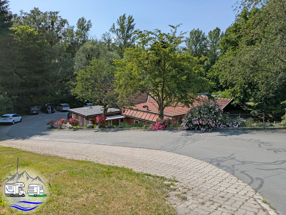 Blick auf die überdachte Terrasse der Teichstubn vom Stellplatz aus