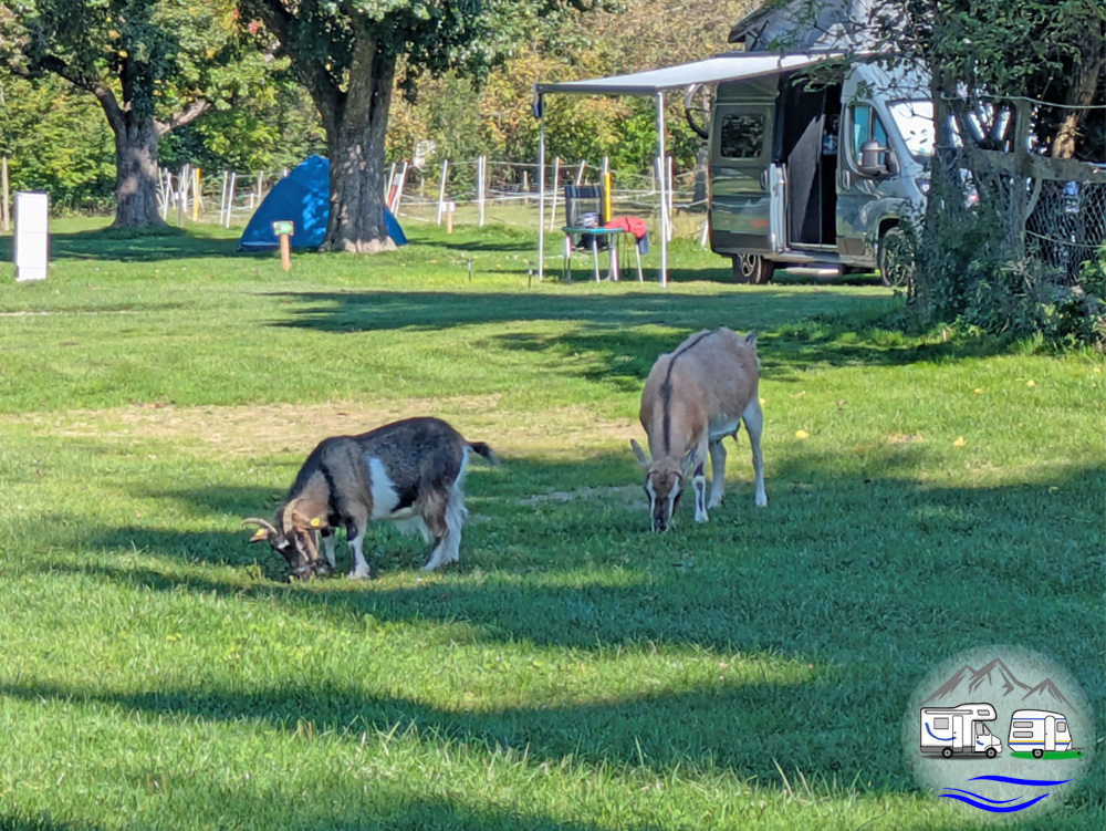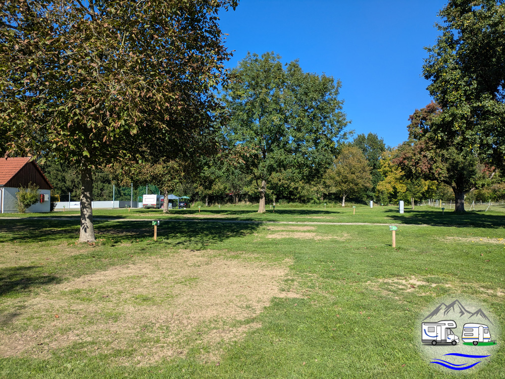 Die Stellplätze sind markiert, aber ohne direkte Begrenzung zum Nachbarn. Über den Platz verteilt stehen große Bäume und der Campingpark ist großteils von Bäumen umgeben. Es gibt also sonnige und schattige Stellplätze. Bei unserem letzten Besuch donnerten die vom großen Walnussbaum fallenden Früchte auf Markise und Wohnmobildach.