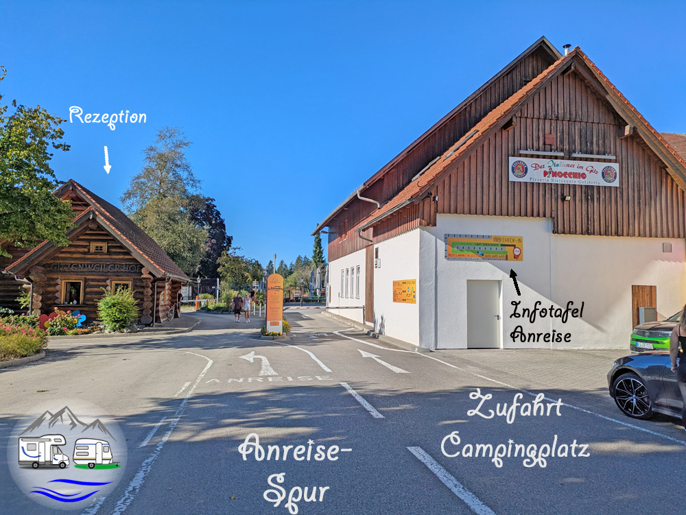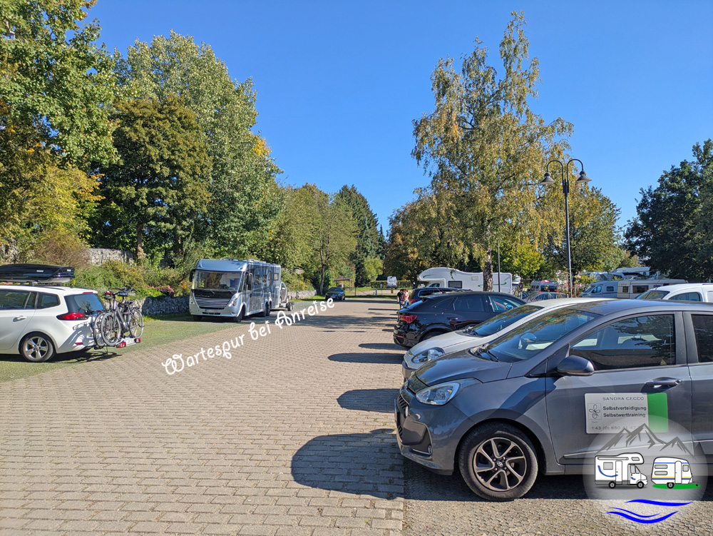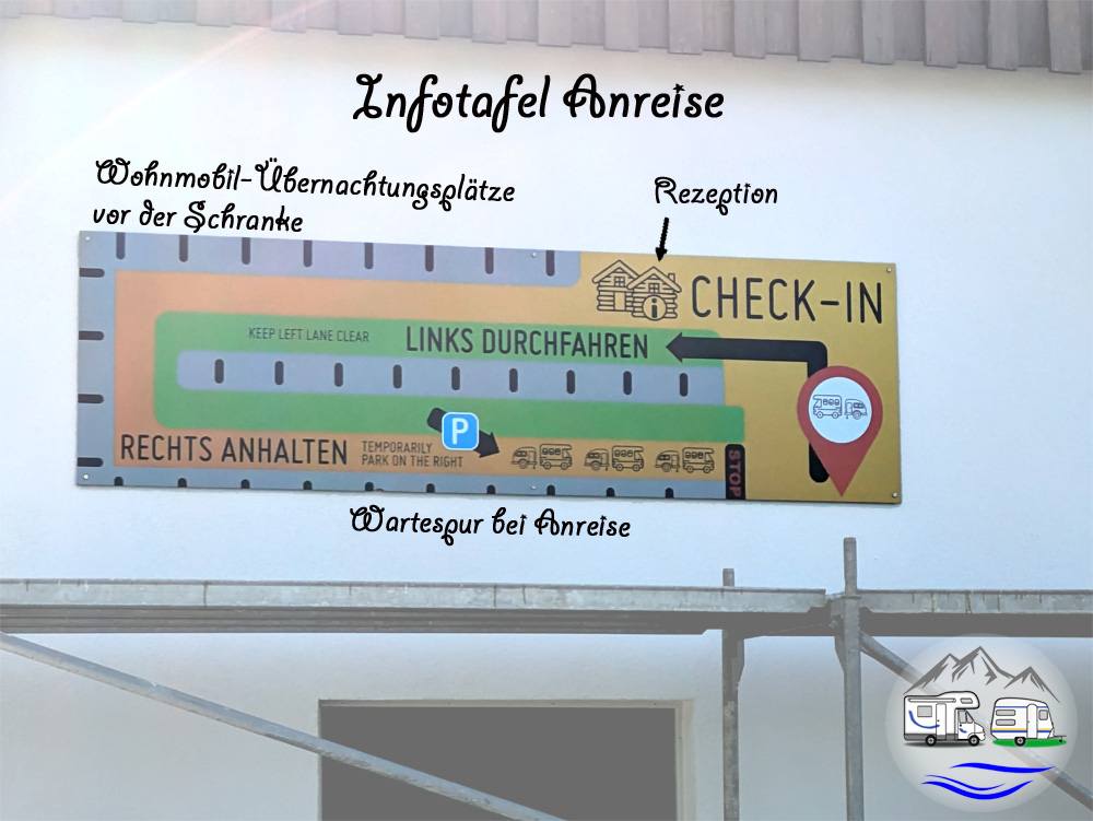 Vor den Schranken des Campingplatzes führt eine Linksabbiegespur auf einen Parkplatz. Auf diesem befinden sich rechts zunächst die Wohnmobil-Übernachtungsplätze, ein Stück weiter dann die Anmelde-Wartespur.