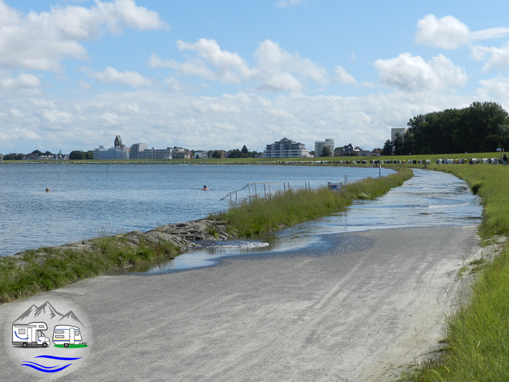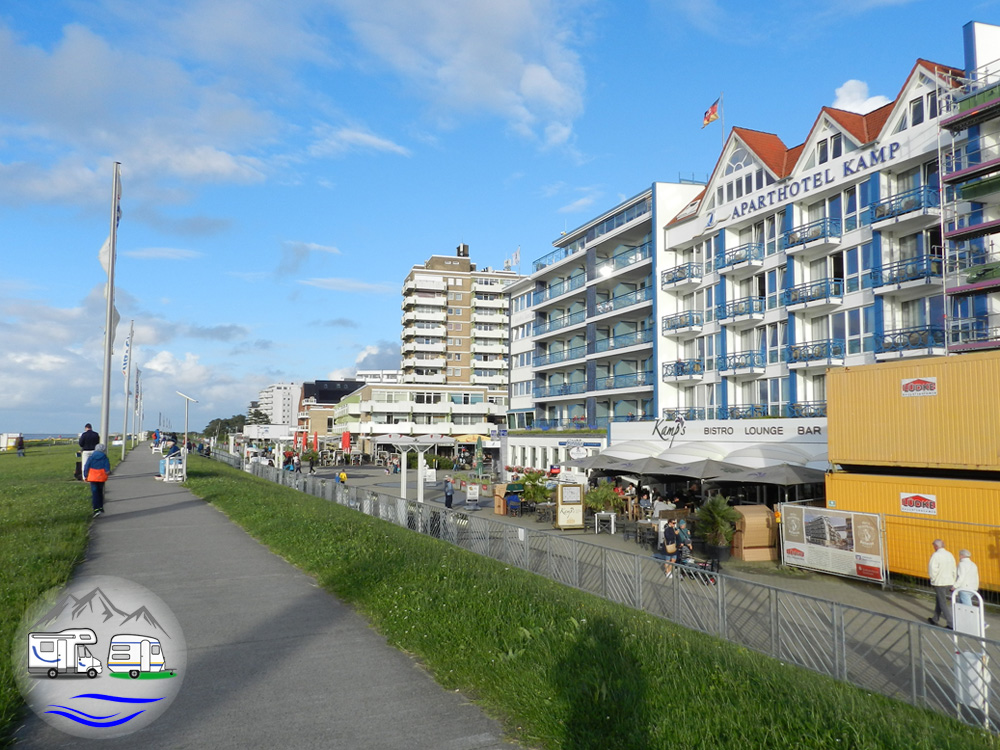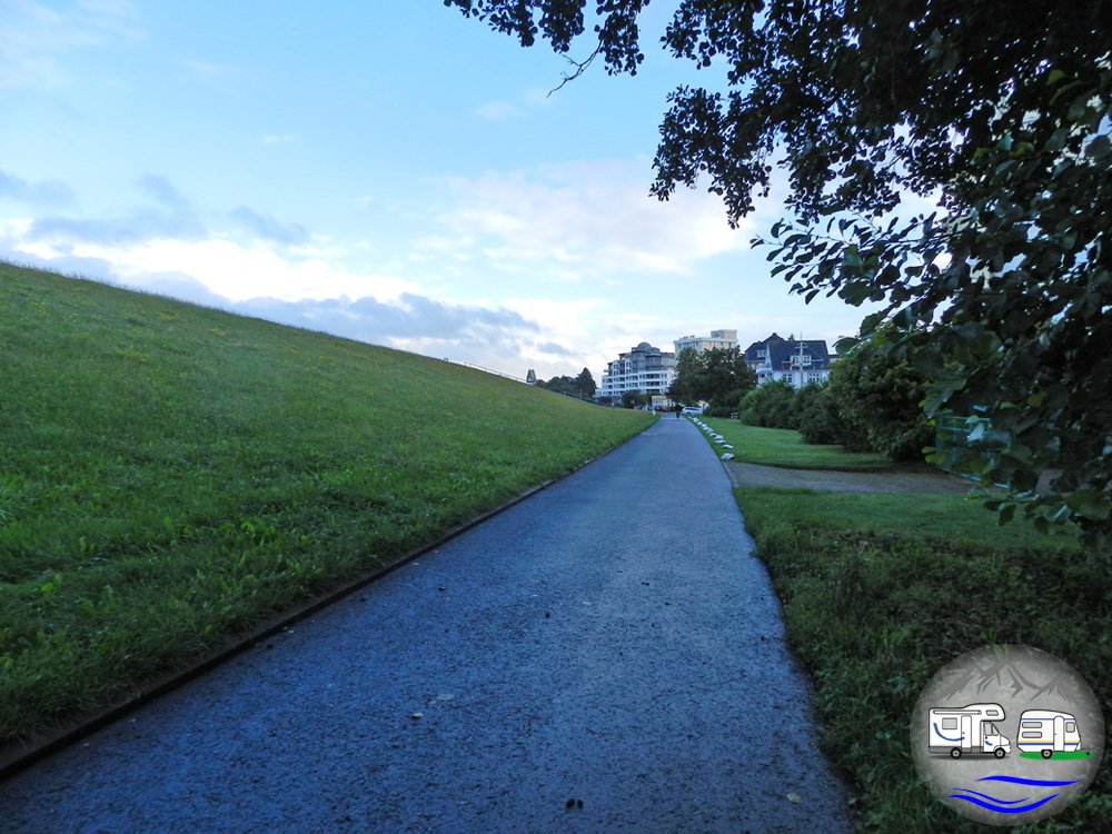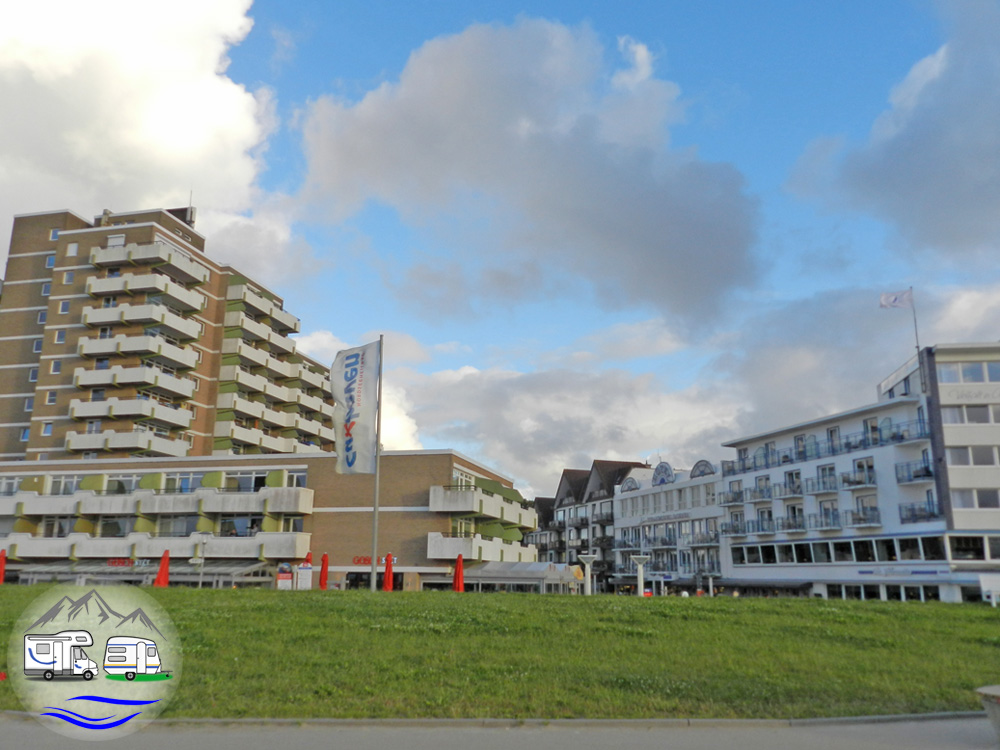 Lief ich Richtung Westen, kam ich in den Stadtteil Duhnen. Dabei kam ich an mehreren Campingplätzen vorbei, die nicht weit hinter dem Deich lagen und gelangte dann zu den großen Hotelanlagen an der Strandpromenade. Den Rückweg nahm ich über die Strandpromenade und entdeckte dabei das Beachvolleyball-Stadion am Strand und das Freibad Steinmare zwischen Strand und Deich.