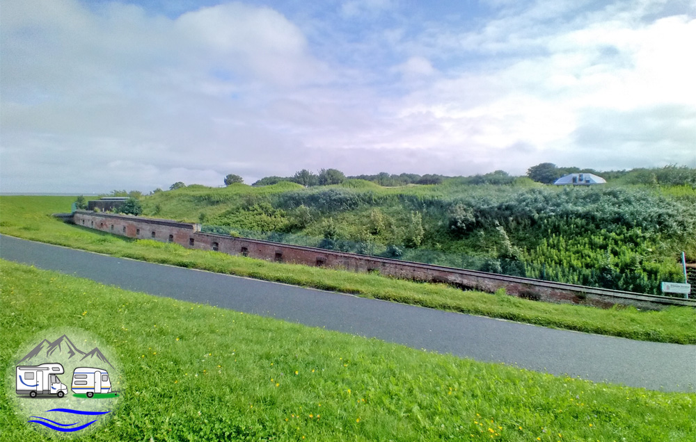 Nahe der Kugelbake befindet sich hinter dem Deich das Fort Kugelbake. Dabei handelt es sich um eine ehemalige Marinefestung, die im 19. Jahrhundert errichtet wurde. Vom Deich aus konnten wir nur die Festungsmauer und einen ehemaligen Flakturm sehen. Den Eingang entdeckten wir auf der anderen Seite über einen Burggraben hinweg.