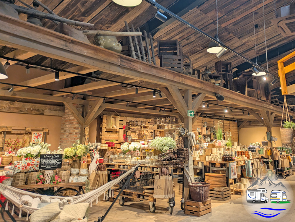 Eine große Halle, die wie eine ehemalige Scheune aussieht, ist das Herzstück der Anlage in Rövershagen. Themenschwerpunkt sind die Erdbeeren. Schon vor der Halle gab es die frischen Früchte, aber auch Pflanzen zu kaufen. In der Halle wurden die Waren in Themengruppen angeboten: