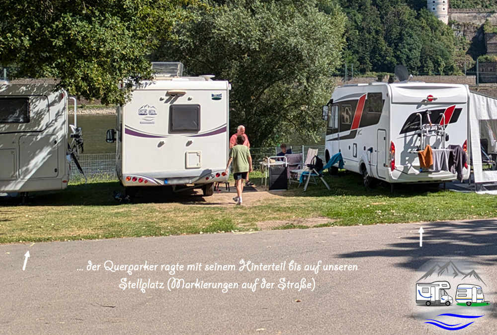 Mit einem großen Wohnwagen oder Wohnmobil hat man manchmal gar keine Wahl. Liegt ein Stellplatz mit der Schmalseite zur Straße und der Breitseite zum Ufer, muss man sich parallel zum Ufer stellen. Ist es andersherum, muss man sich parallel zum Weg stellen.