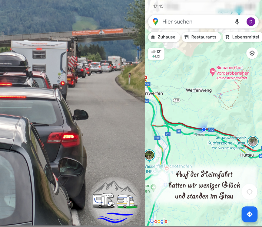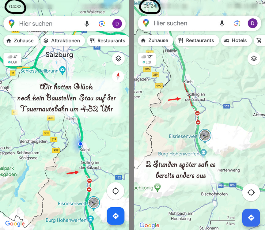 Zeitweise habe ich von Zuhause aus auf Google Maps die Verkehrslage verfolgt: abends ab 21/22 Uhr scheint der Verkehr auf der Tauernautobahn weniger zu werden.