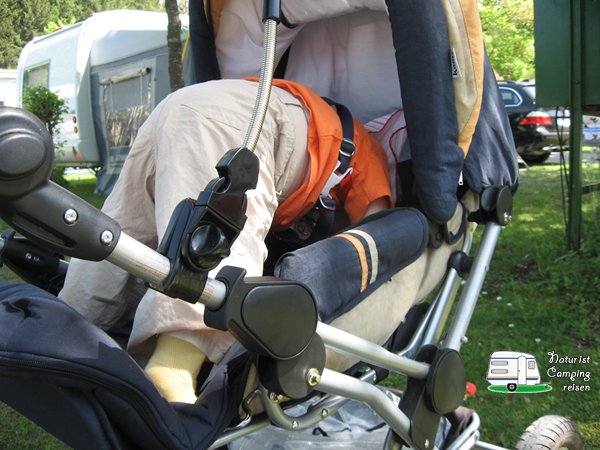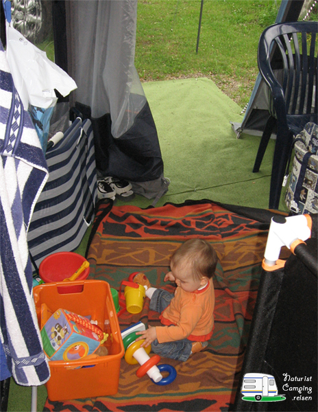 Am nächsten Morgen war alles halb so wild, der Vorzeltteppich nur stellenweise nass. Wir breiteten eine Decke aus, um unsere Tochter trotzdem im Zelt krabbeln lassen zu können. Natürlich reichte ihr der eingeschränkte Platz nicht aus und sie quengelte. Auch bei Ferdinand meldete sich der Stress zurück, da er für seine Selbständigkeit noch etwas arbeiten wollte.