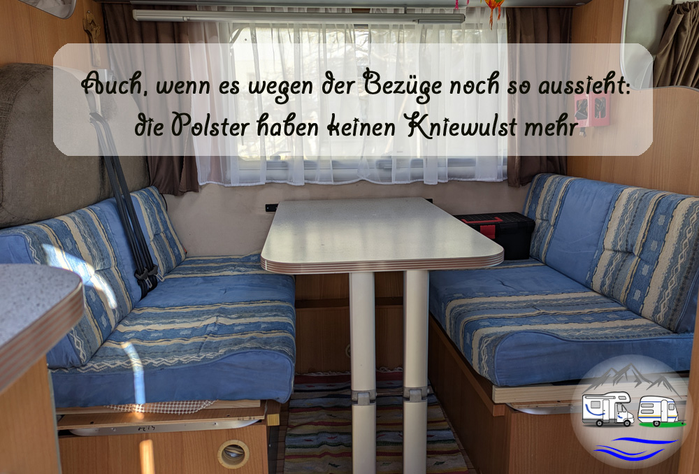 - Wir warfen die alten, durchgesessenen Polster der Sitzgruppe raus. Dabei stellten wir fest, dass sich unter dem dunkelbraunen Bezug die blau gemusterten Originalbezüge versteckten. Die neuen Polster präsentieren sich jetzt in blau, sind allerdings immer noch nicht das Gelbe vom Ei, was den Sitzkomfort betrifft.