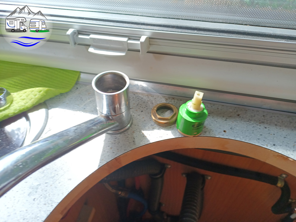 Er baute also den Wasserhahn auseinander und bestellte eine neue Kartusche. Über Amazon, weil sie dort nur 8€ kostete und nicht 25€ wie beim Campingfachhändler vor Ort. Mit der neuen Kartusche und nachdem das neue Dichtmaterial (Flüssiggummi) getrocknet war, funktionierte der Wasserhahn wieder problemlos.