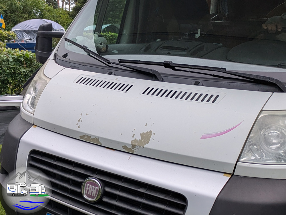 - An der Motorhaube ist Lack abgeplatzt. Ich finde es furchtbar, meinen Mann stört es nicht. Falls jemand einen Tipp hat, wie wir die Motorhaube einigermaßen kostengünstig wieder schönmachen können, schreibt ihn gerne in die Kommentare.