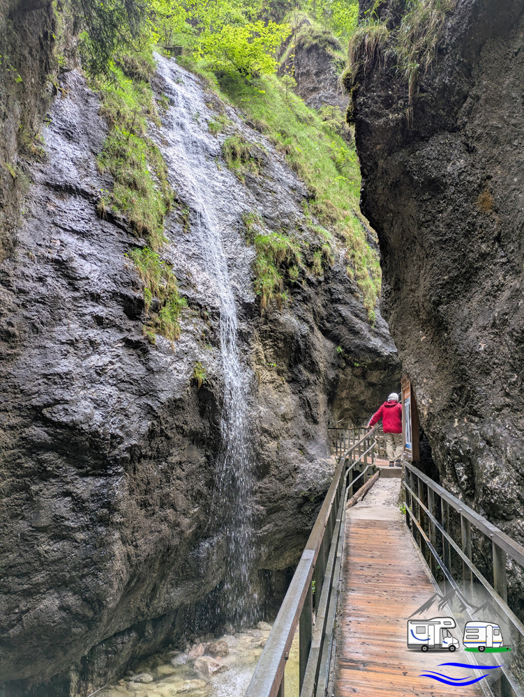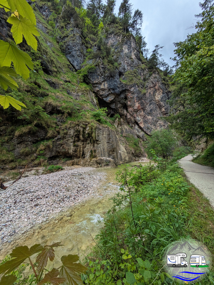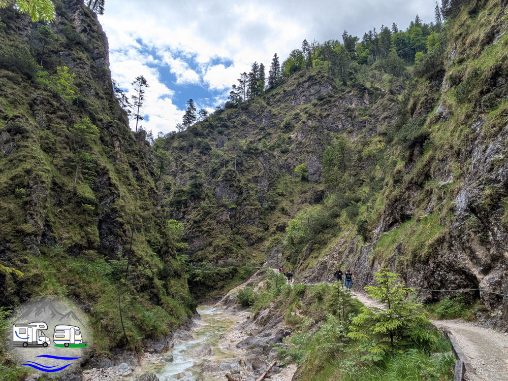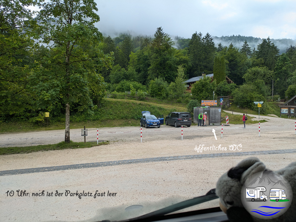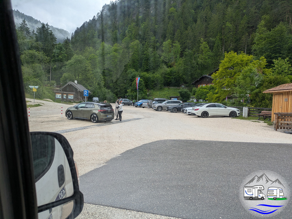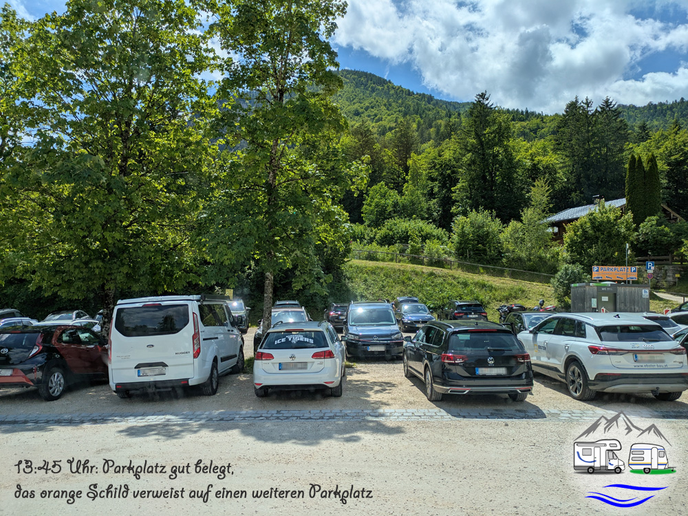 Der erste Parkplatz an der Zufahrtsstraße war nur für PKW. Doch hinten, vor dem Eingang der Almbachklamm, kamen wir auch mit Wohnmobil unter. Am frühen Nachmittag hätte das anders ausgesehen.