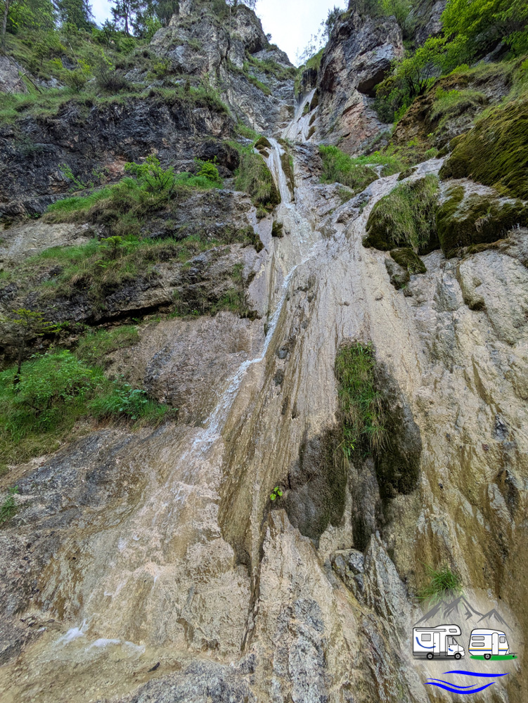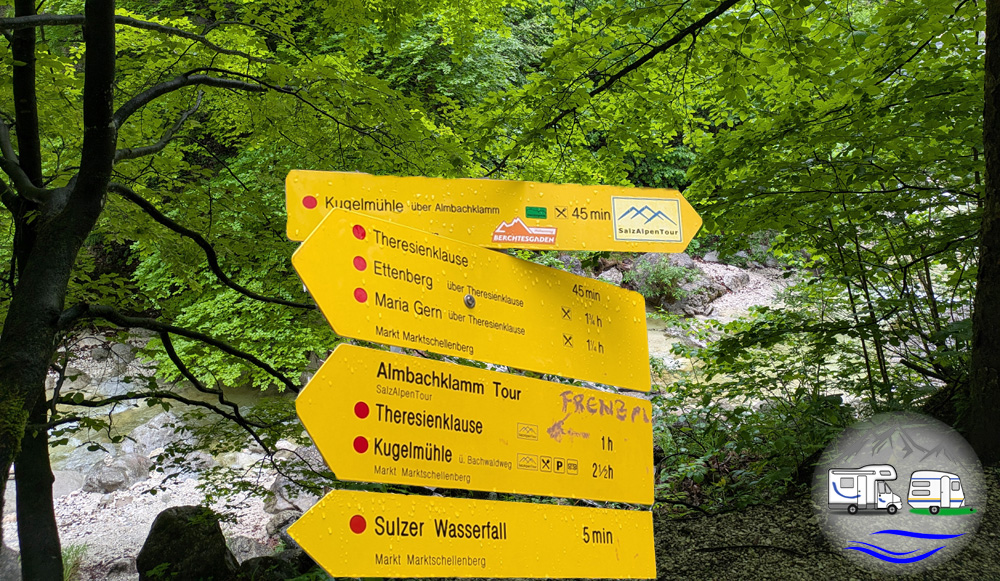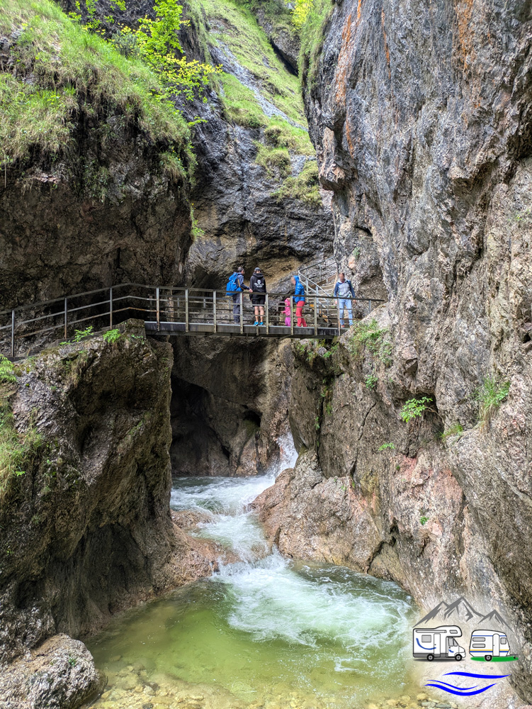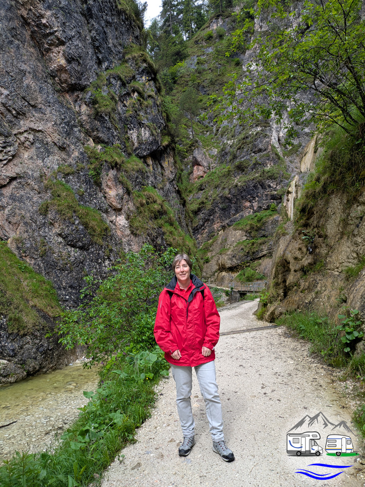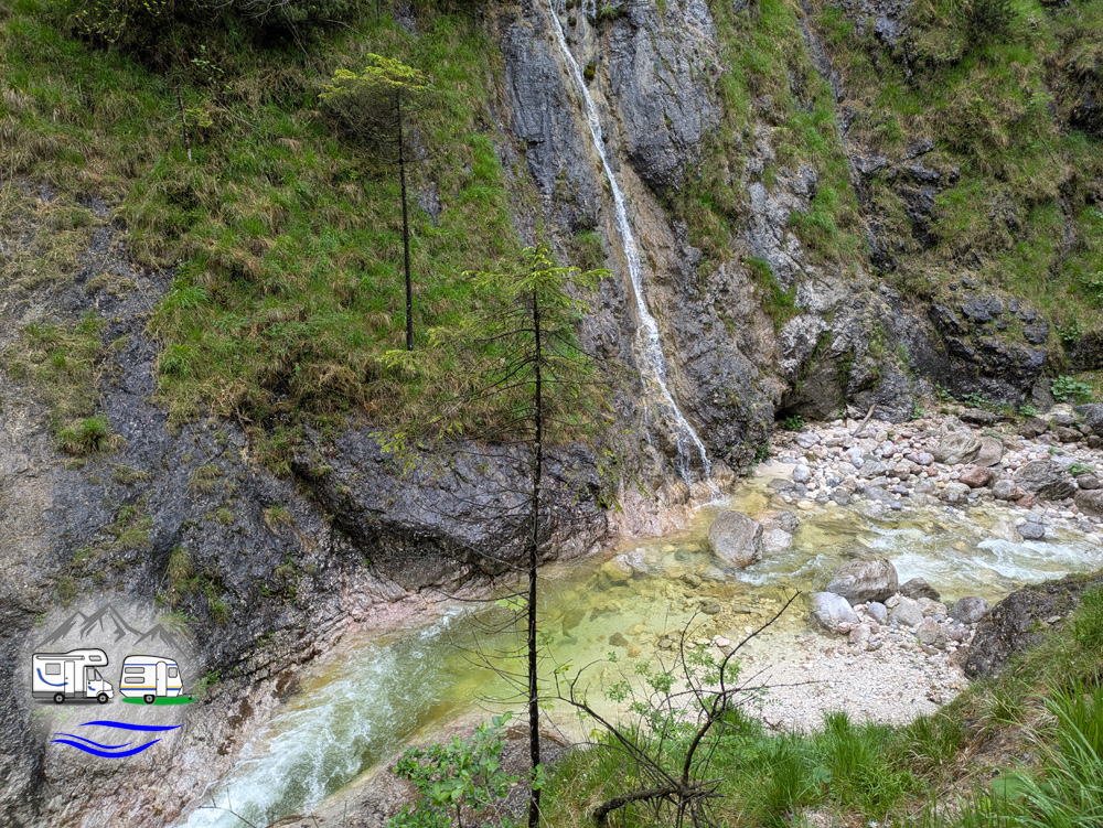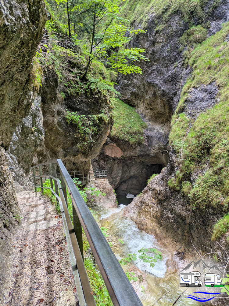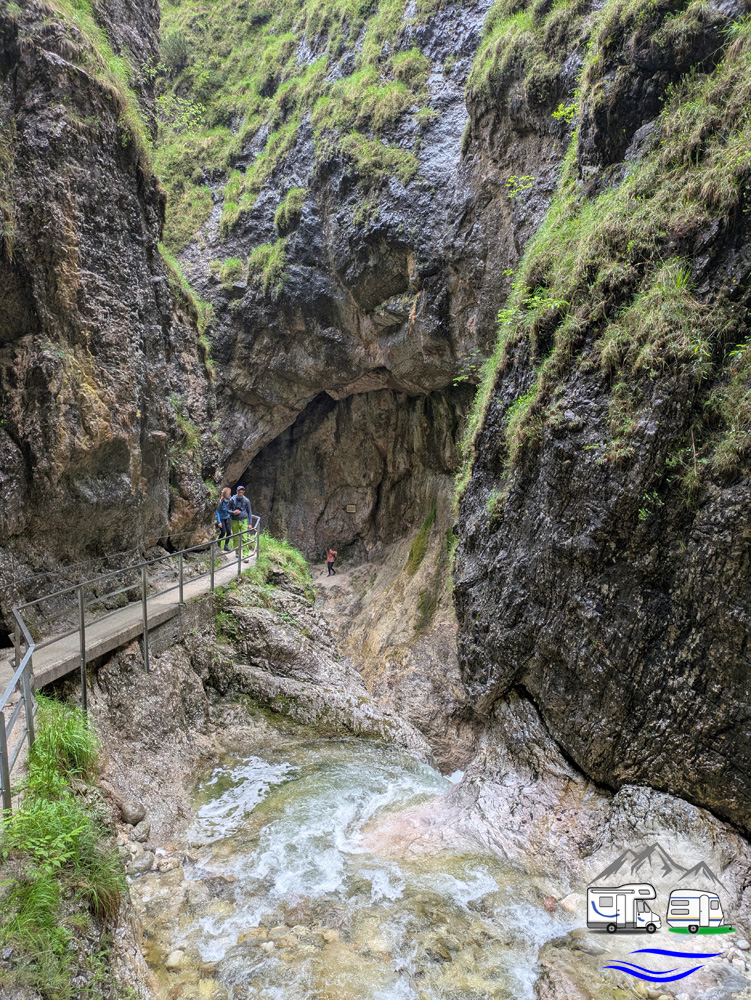Der erste Parkplatz an der Zufahrtsstraße war nur für PKW. Doch hinten, vor dem Eingang der Almbachklamm, kamen wir auch mit Wohnmobil unter. Am frühen Nachmittag hätte das anders ausgesehen.