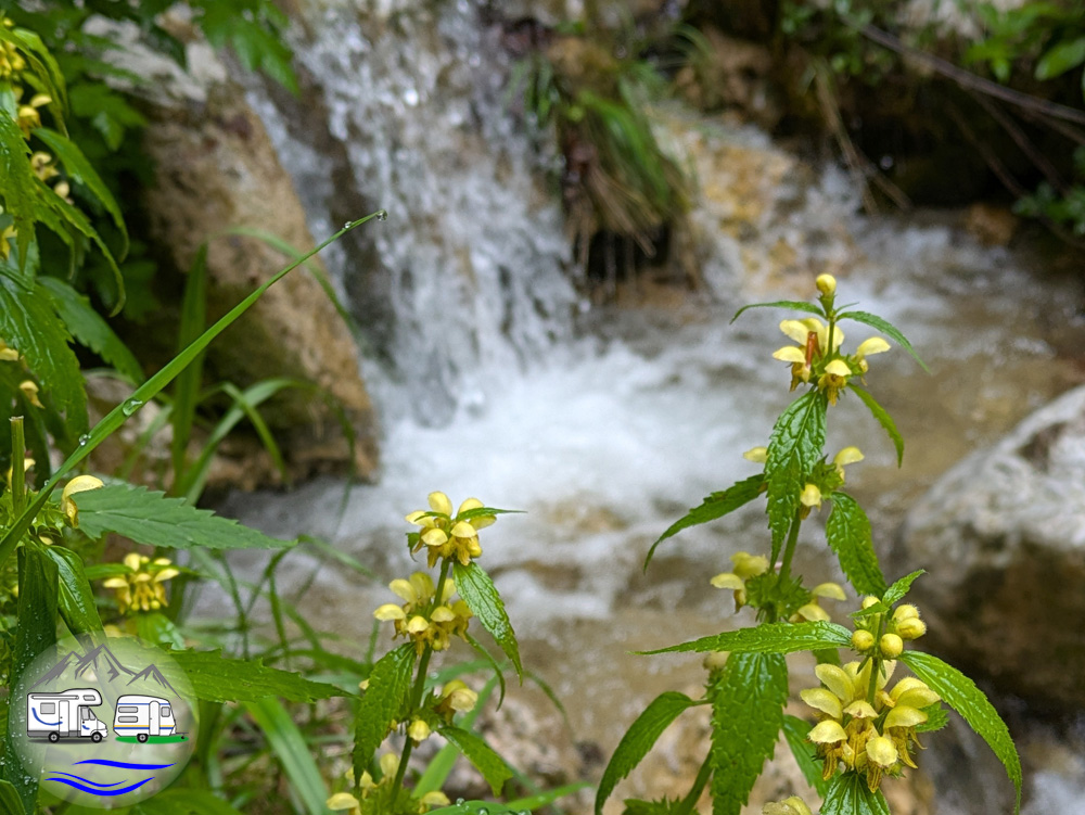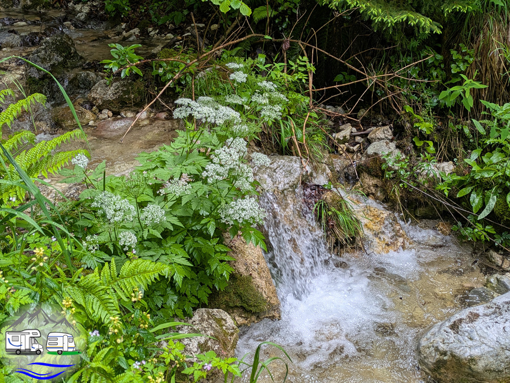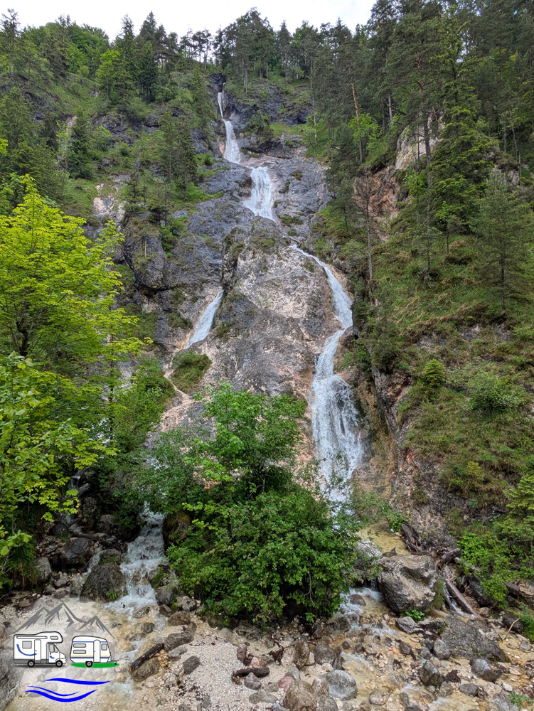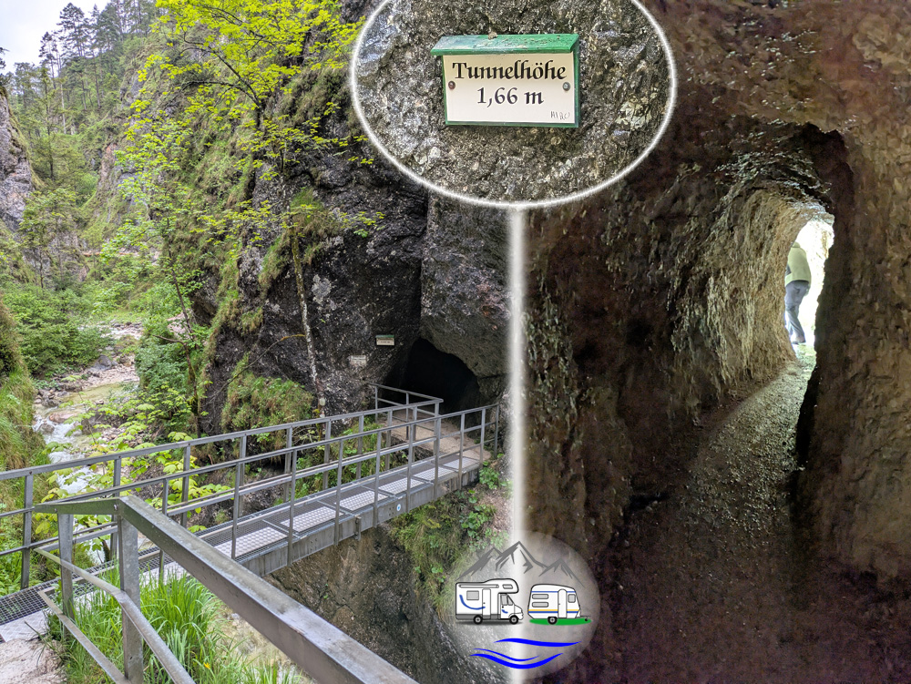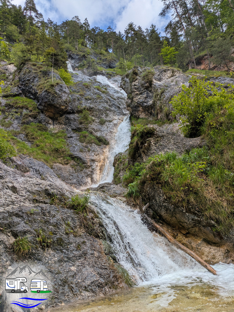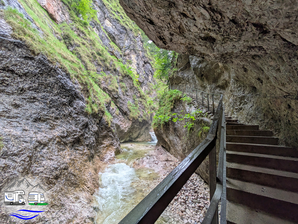 Der erste Parkplatz an der Zufahrtsstraße war nur für PKW. Doch hinten, vor dem Eingang der Almbachklamm, kamen wir auch mit Wohnmobil unter. Am frühen Nachmittag hätte das anders ausgesehen.