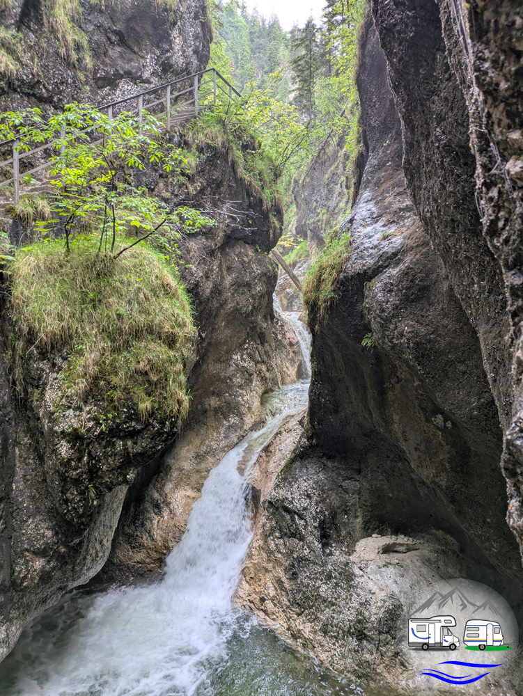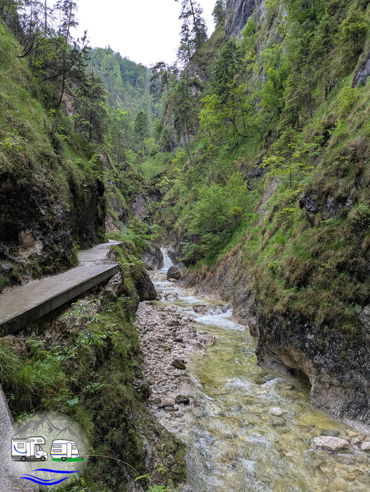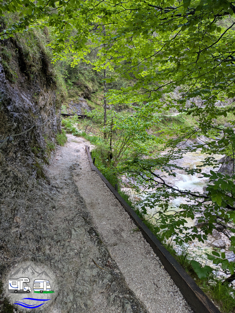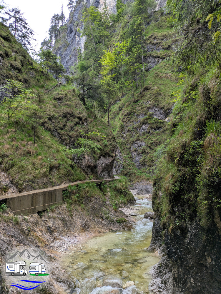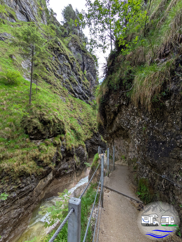 Die ersten 50 Meter waren Weg und Almbach noch relativ gemütlich. Dann jedoch schoben sich die Berghänge zusammen, mit dicht an den Felsen gedrängtem Weg. Kurz darauf begannen die Brücken und die in Fels gehauenen Stege.