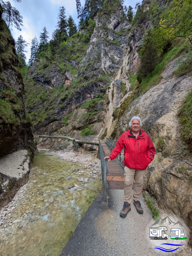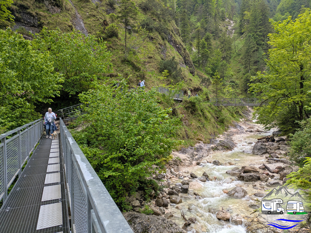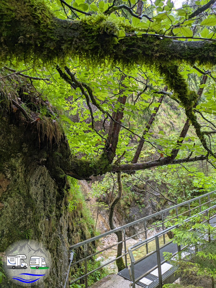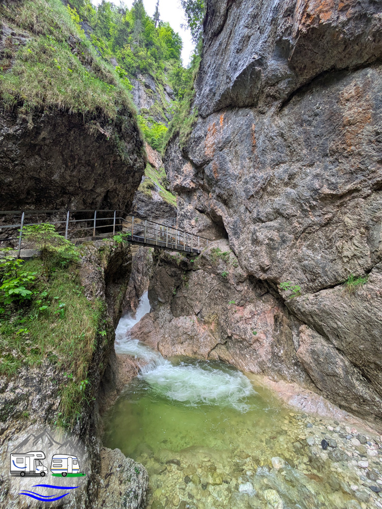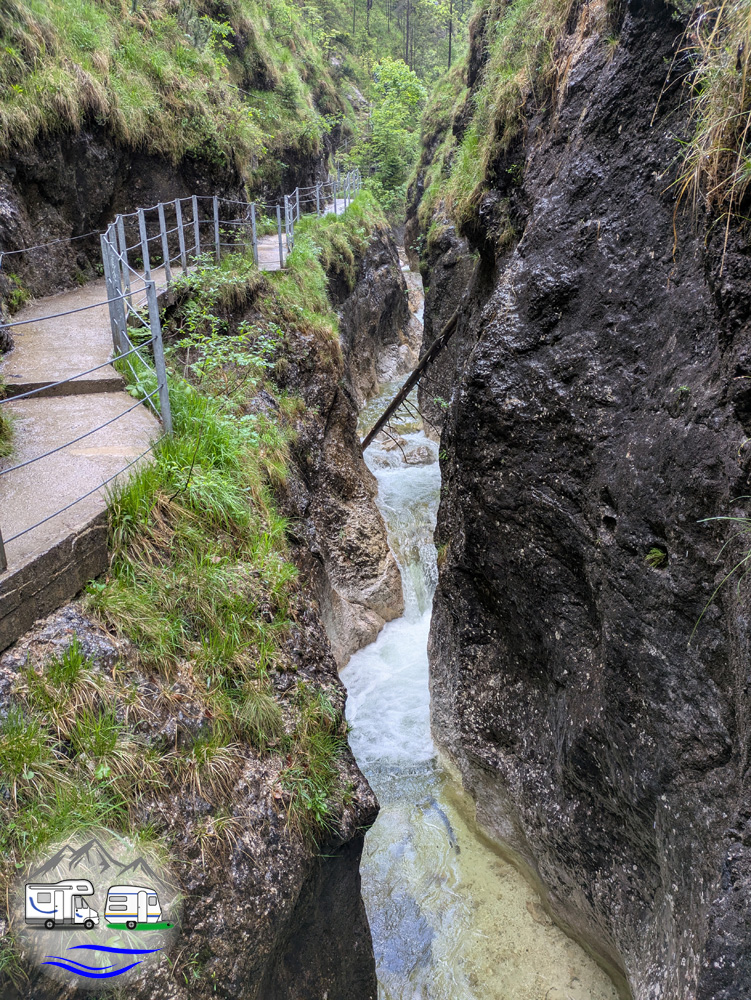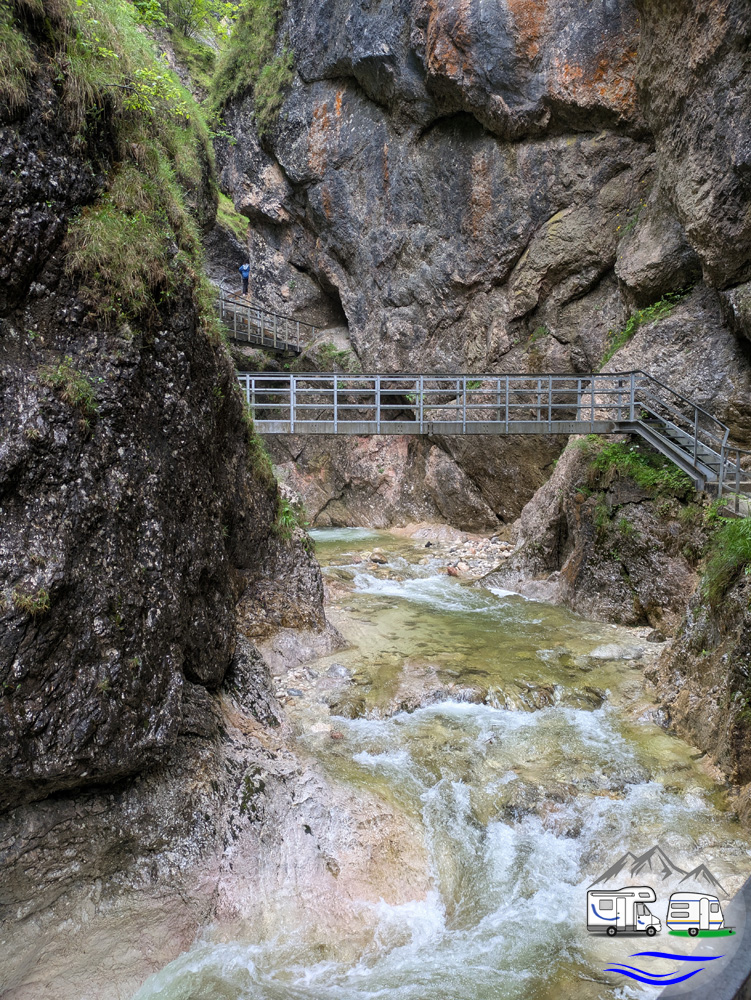 Die ersten 50 Meter waren Weg und Almbach noch relativ gemütlich. Dann jedoch schoben sich die Berghänge zusammen, mit dicht an den Felsen gedrängtem Weg. Kurz darauf begannen die Brücken und die in Fels gehauenen Stege.