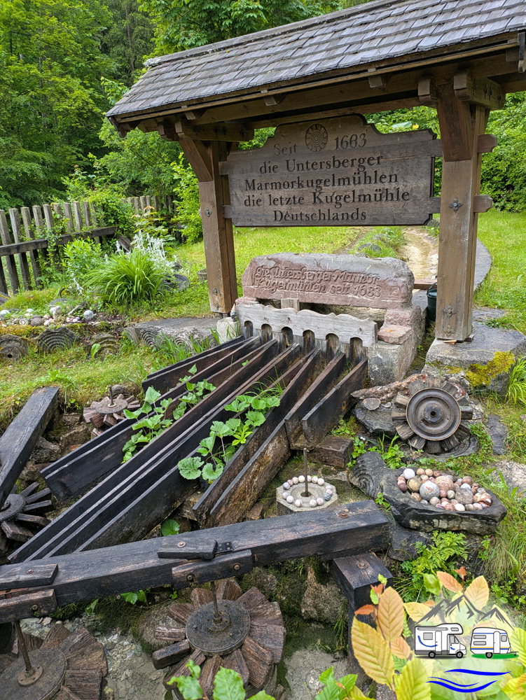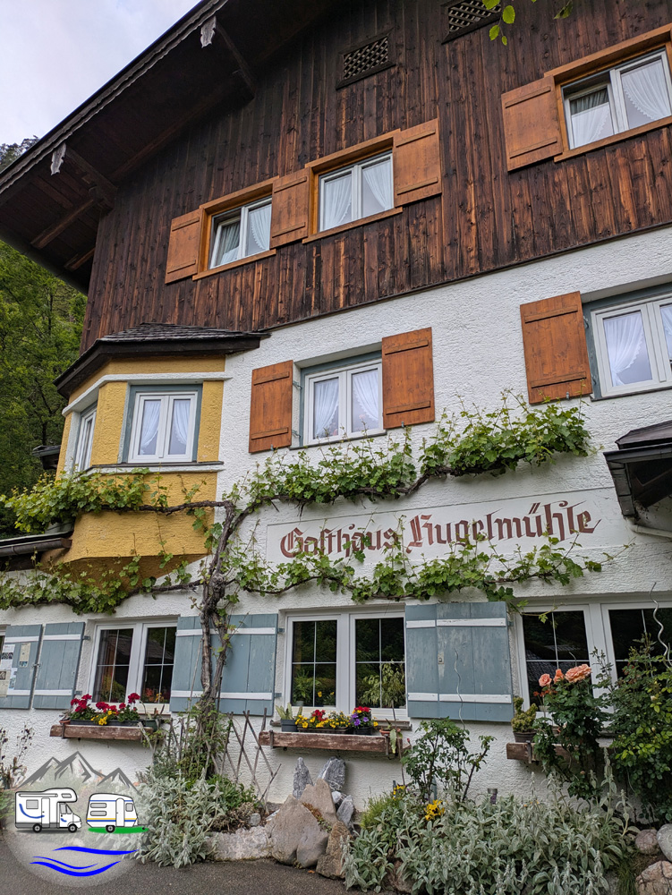 Noch hingen dicke Wolken über dem Tal, aber wenigstens regnete es nicht mehr. Eine Brücke über den Almbach brachte uns direkt zum Gasthof Kugelmühle. Die seit dem 17. Jahrhundert bestehende Marmorkugelmühle existiert noch heute – wenn auch nur noch zu touristischen Zwecken. Wir erlebten sie leider nicht in Aktion.