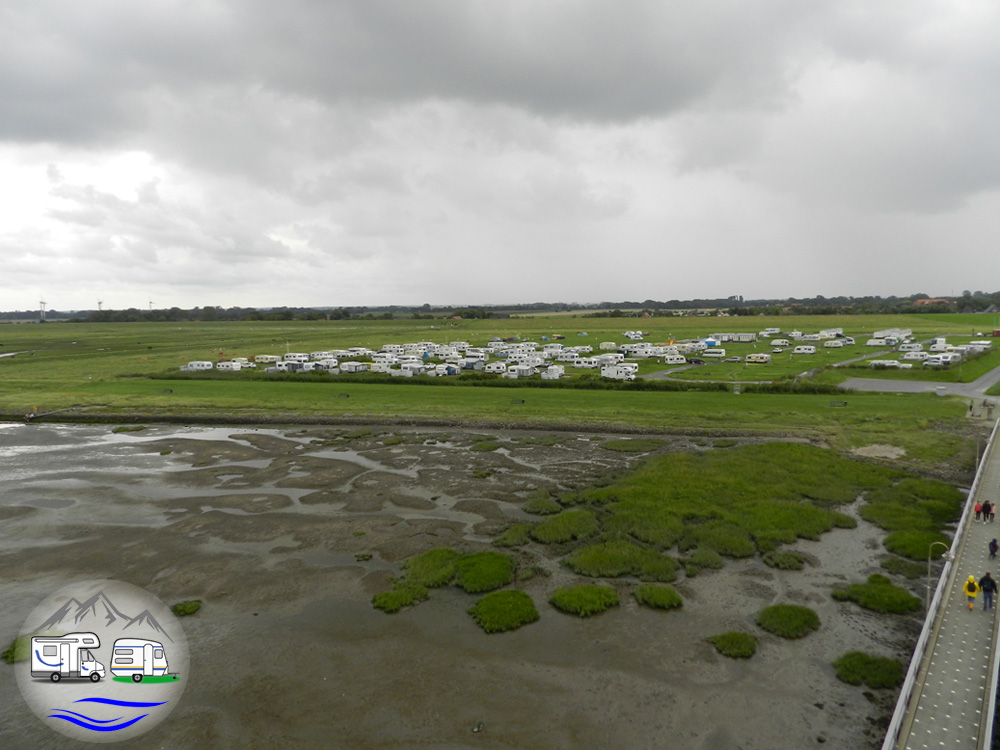 Blick vom Deich auf den Außendeich-Campingplatz Cappel-Neufeld