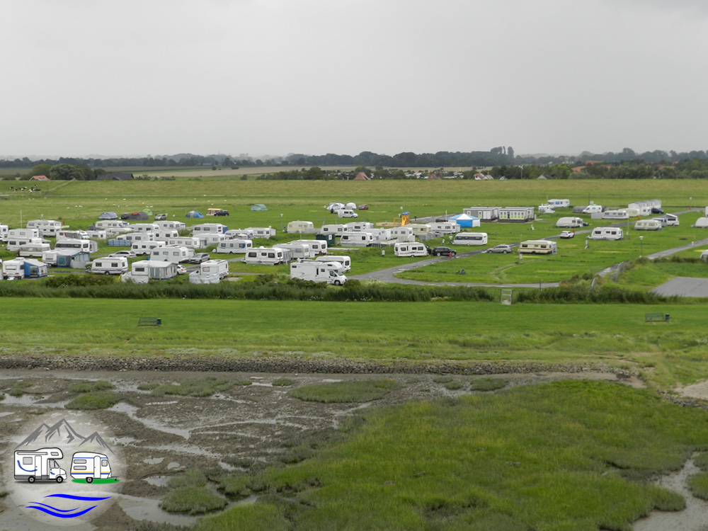 Blick von oben auf Salzwiesen und Campingplatz