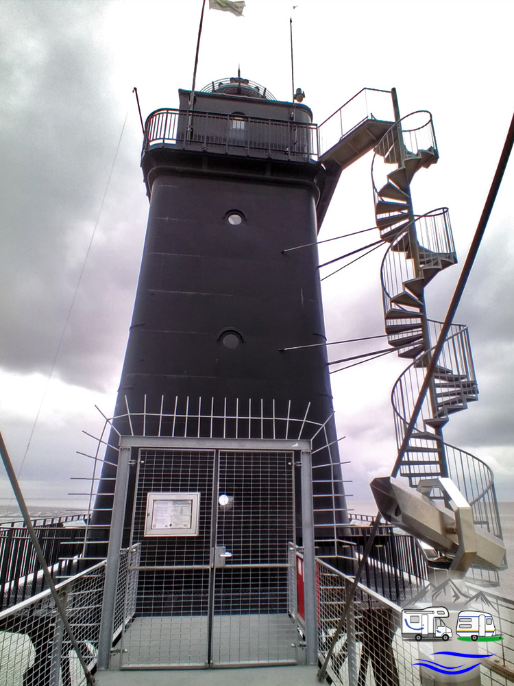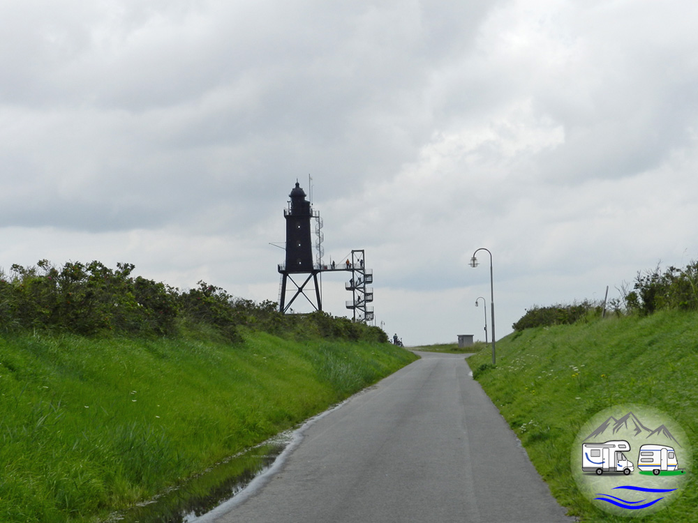 Wir konnten ihn von hier aus sehen, den Leuchtturm Obereversand, der inzwischen als Denkmal dient. Aber auf der Straße hinter dem Deich wollte ich nicht laufen, also fuhren wir zusammen mit dem Auto hinüber.