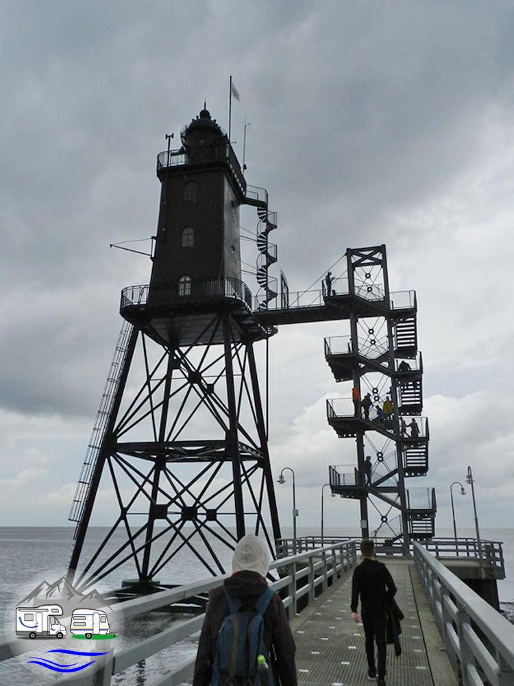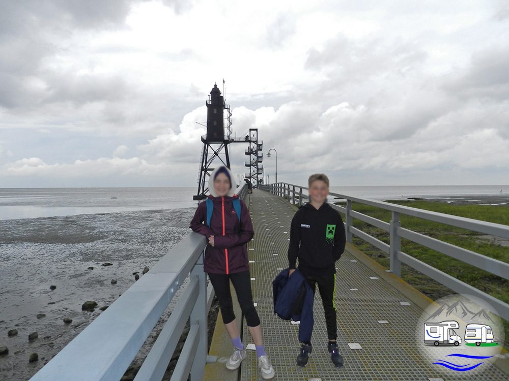 Eine Brücke führte uns ein Stück ins Watt hinaus bis zum Treppenaufgang. Vier Stockwerke hoch erklommen wir die Metallstufen, begleitet von ersten Regentropfen. Weiter kamen wir nicht. Der Turm hatte nur Fr/Sa/So nachmittags geöffnet und es war Mittwochvormittag.